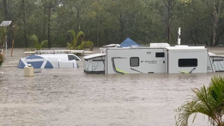 Dramatic photographs shared on the Caravan & Camping Australia Facebook page showed several caravans partially submerged underwater, after between 100 and 300mm of rain fell in a matter of hours on Friday night and into the early hours of Saturday morning.