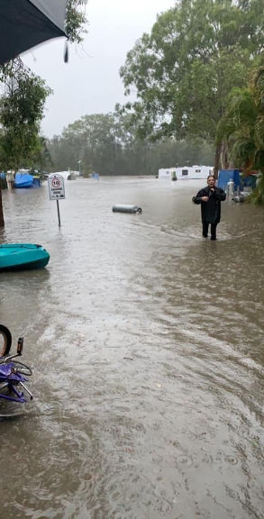 One photo showed someone wading through the knee-deep flood water at the Big4 Gold Coast Holiday Park in Helensvale, alongside the caption: “This morning on the Gold Coast caravan park, came up so quick.”