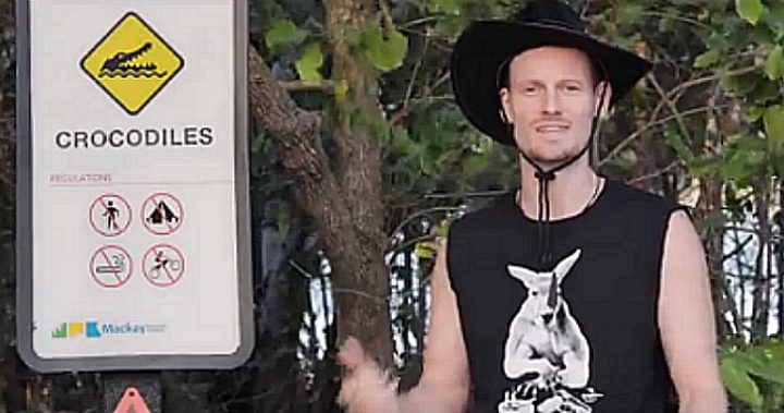 “Welcome to North Queensland Australia. Fancy a swim in a tropical paradise?” Chris says in the video. “You can’t do that here because there’s crocodiles. Oh but don’t worry, they’ve made a sign.”