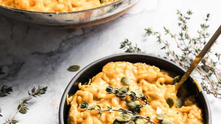Add the pumpkin about 15 minutes before the end of cooking. It will break down and give the risotto a beautiful golden colour.