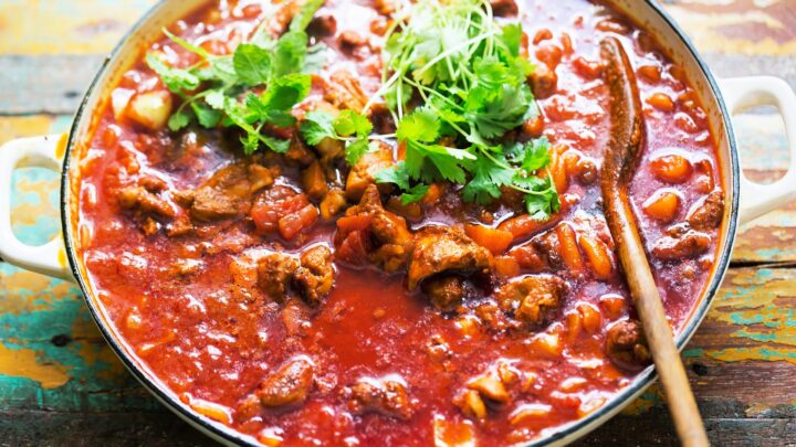 Add the apricots and sultanas, and with lid on, allow to cook gently for and 45 minutes, still at a low simmer. Checking to make sure the ingredients don’t stick to the bottom of the pot. If sticking you can add a bit more orange juice or stock. If you find the sauce needs thickening before serving mix in cornflour. Make sure you mix the cornflour first with water before adding to pan.