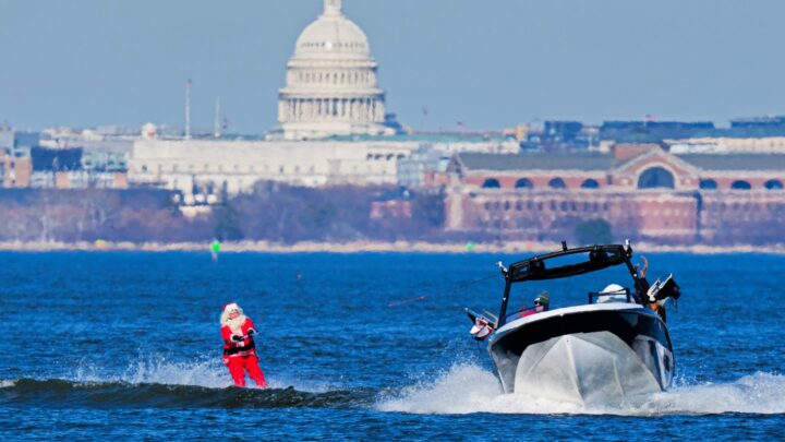 Santa Claus waterskis during a Waterskiing Santa event on December 24, 2025 in Alexandria, Virginia. Santa and his elves faced off against the Grinch in the annual water show on the Potomac River. (Photo by Aaron Schwartz/Getty Images)