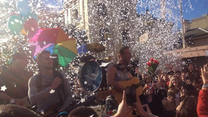 Chris Martin and the Coldplay team took to the streets singing their way around swarmed by hundreds of Aussie fans. They were showered with confetti and danced with one of their music idols.