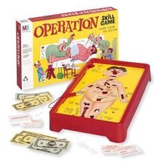 Operation is a battery-operated game of skill, you had to use your hand-eye coordination to remove body parts of the 'patient' in return for money. It's a tricky game because the pieces of the ailments fit neatly into spaces provided on the board.