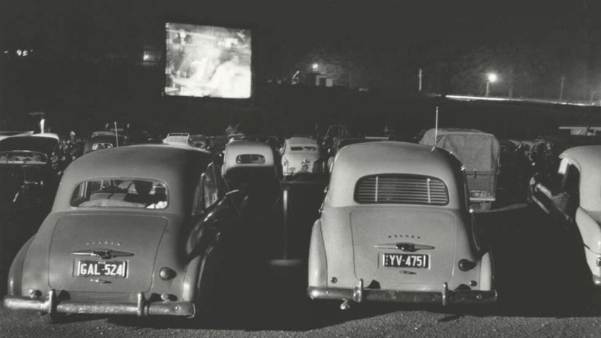 Night view of cars during a screening at the Skyline drive-in at Camberwell, Melbourne, Victoria. Source: Jeff Carter / National Library Australia