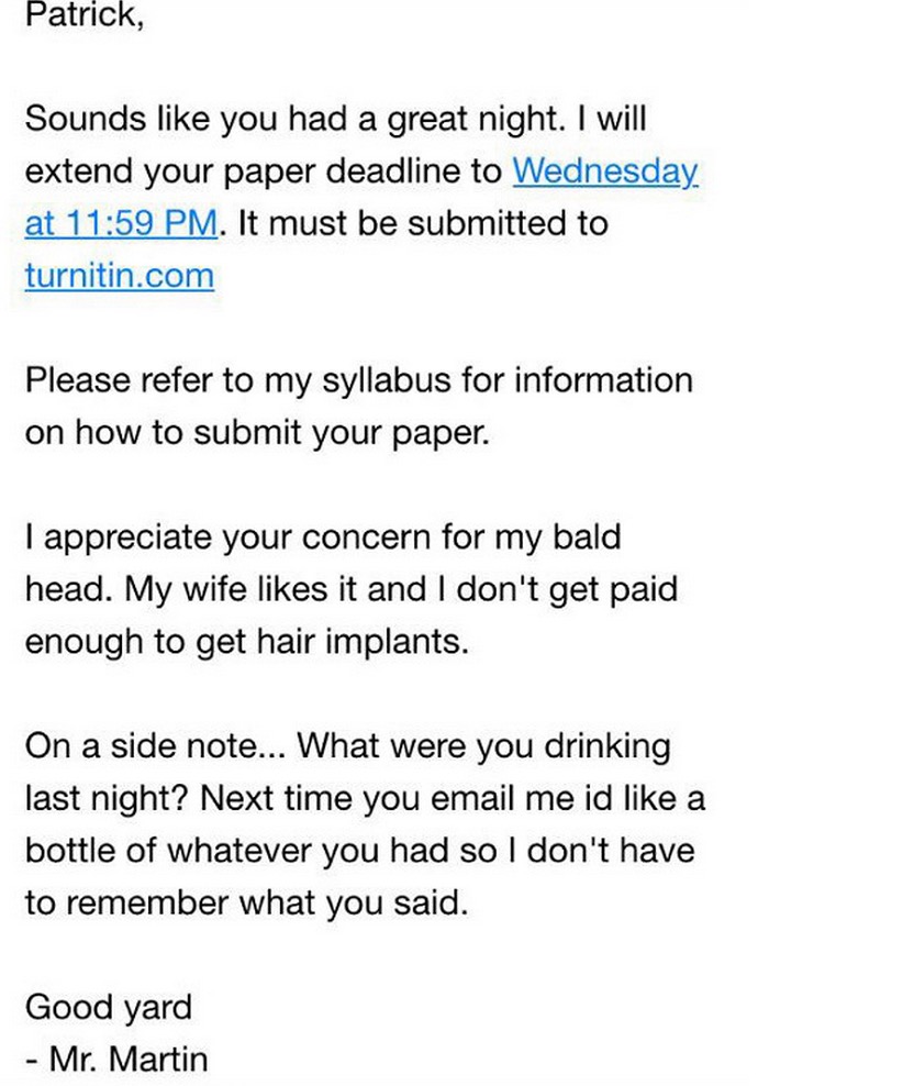 Considering the student was completely hammered when he pulled out his phone to text his teacher, the lecturer had two options. He could have disciplined the student, taken offence to his personal comments and refused the extension. Or, he could have done this: