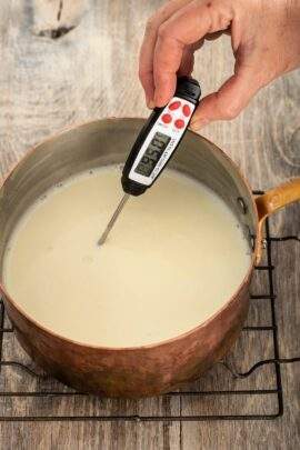 If you want to cool your milk quickly because, you know, you have a life to get back to, don’t pour it into another container from a height – you’ll end up with too much aeration. Just sit the saucepan in a sink of cold water until the temperature comes down to 45°C.