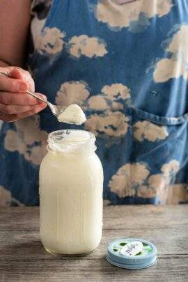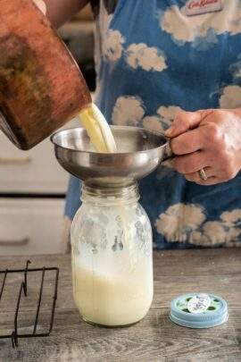 Add the yoghurt – this can be from your last batch (‘backslopping’), or any plain yoghurt with live cultures – and stir well or whisk into the cooled milk.