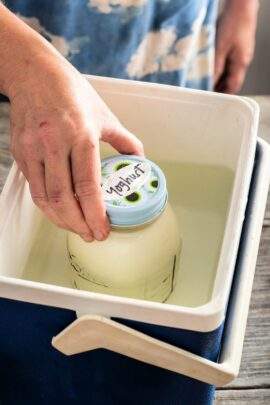 You can incubate yoghurt a hundred different ways. We like the esky method, but I’ve seen people incubate yoghurt in dehydrators, in water baths in an oven with a pilot light on, wrapped on top of woodstoves, and a friend of a friend made it in prison in a rice cooker set on warm. Perhaps some unfortunate life decisions, but excellent gut health.