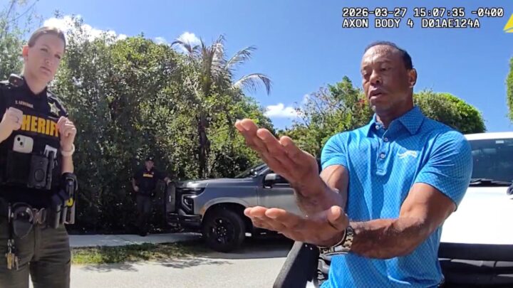Bodycam footage of the aftermath of the crash released by the Martin County Sheriff’s Office shows Woods making a phone call and can be heard saying “thank you so much” before being asked by an officer to stay “down here with us please”.
