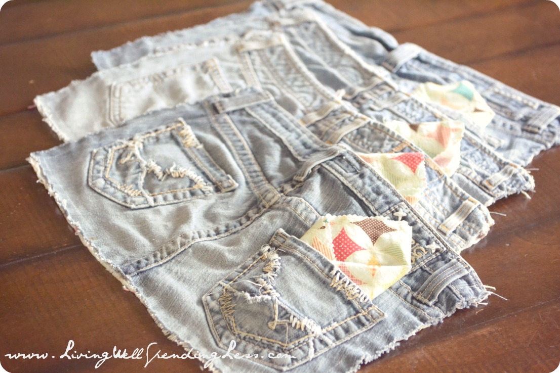 Extra step: If you wanted to make matching placemats cut cloth napkin-sized from the extra fabric. Fold into triangles and tuck into the back pocket of the denim. You could also use the pocket for cutlery.