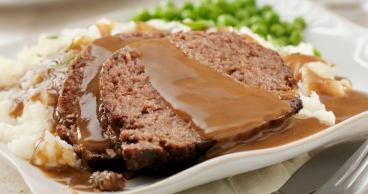 - Bake for 30 minutes. Make sure top is browned and comes away easily from the sides of the pan. Drain excess juice. Use remaining barbecue sauce to spread over the top. Bake again for 15 minutes, until the meatloaf is cooked through. Set aside for 5 minutes to cool slightly. Serve with steamed vegetables and chicken gravy.
