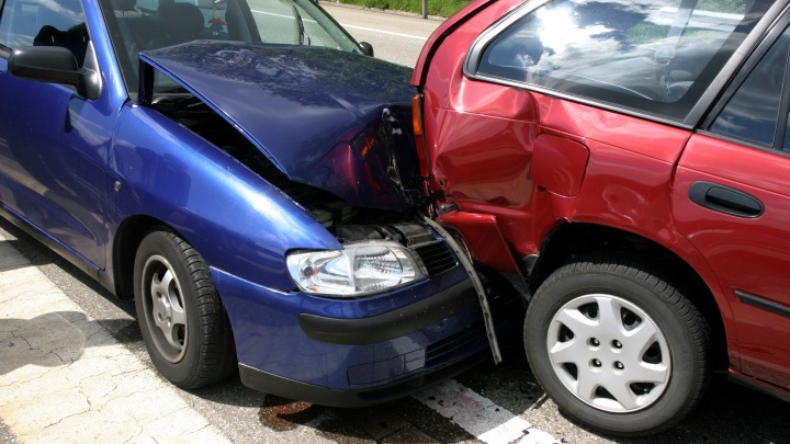 A woman and a man get into a car accident. Neither of them are hurt, but both cars are totally wrecked.