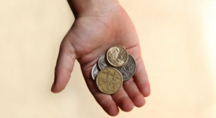 The cashier pulls out a single dollar coin and places it in one hand then holds a five dollar note in his other hand.