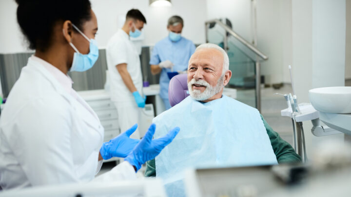 A patient sits in the dentist’s chair with severely fractured front teeth.