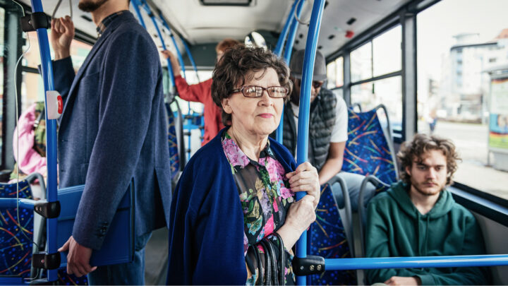 An elderly lady boarded a very crowded bus and, as all the seats were taken, she stood in the middle.