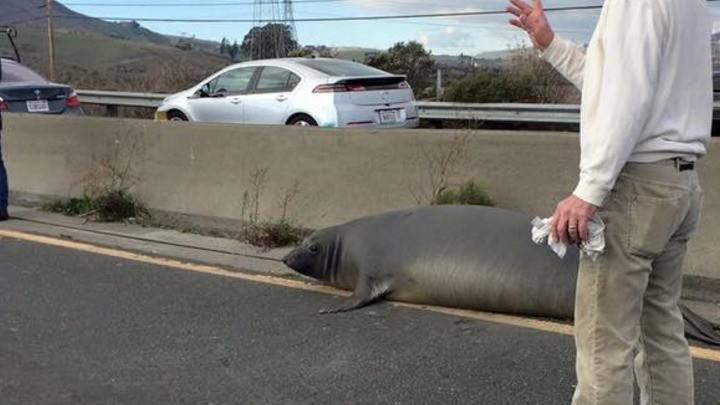 A 900 pound elephant seal shut down Highway 37 in Sonoma County, northeast of San Francisco, when she decided that she wanted to cross the road.