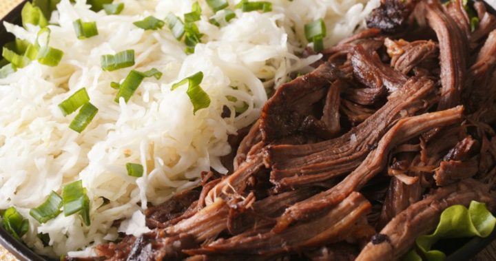 4. Using forks, shred beef into large pieces. Serve beef with rice and Asian greens. Drizzle with stock mixture.