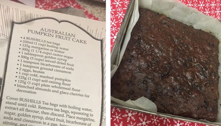 This beautiful looking fruitcake being baked by a friend, popped up on my wall this morning. With her permission, I am sharing it with you. It’s an old recipe from a Bushell’s Tea box and it looks amazing.