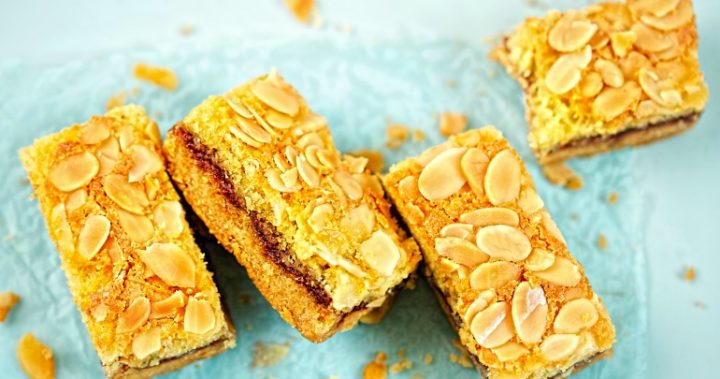 This classic raspberry jam slice is a tried-and-tested crowd pleaser — and you only need a few simple ingredients. The base is lovely and soft, while the topping brings plenty of delicious flavours with sweet raspberry jam and crunchy flaked almonds on top.