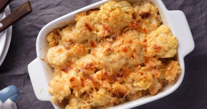 - Heat oven to 220C. Grease ovenproof dish. Pour cauliflower mixture into dish. Tip sauce over the top. Scatter with breadcrumbs. Bake for 30 minutes until golden and crisp. Serve hot.