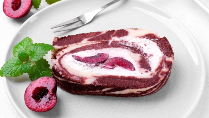 This black forest cake roll is a light choc-vanilla marbled sponge cake with a cherry cream filling. It is vegan, which means there are no eggs, no dairy, and while it has some sugar in it, it’s perhaps not as much as a traditional cake roll. To be honest, I was quite surprised at how moist this cake was.