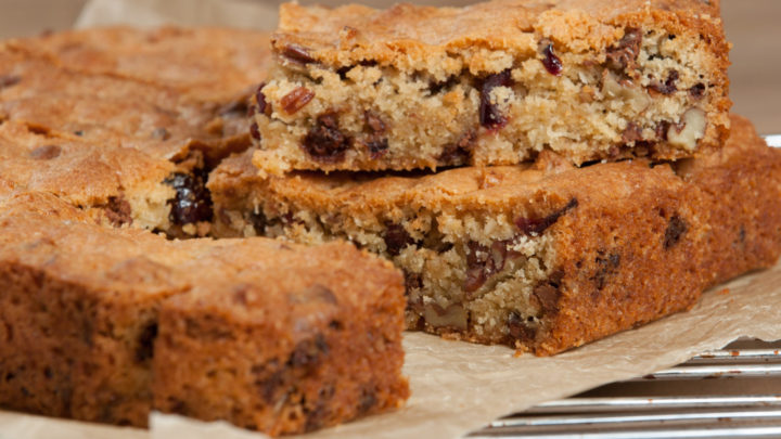 - Spoon mixture into prepared pan. Smooth over top. Sprinkle with remaining chocolate chips. Bake for 25 minutes or until firm to touch and golden brown. Cool completely in pan. Slice into bars. Serve.
