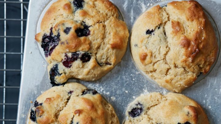 - Pour wet ingredients into dry ingredients. Stir until just combined. Fold in blueberries.
