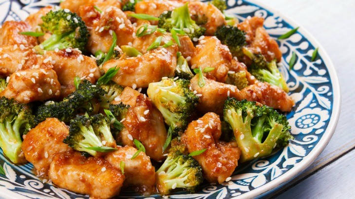 5. Toss chicken in honey and serve garnished with sesame seeds and broccoli and a side of steamed rice.