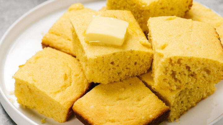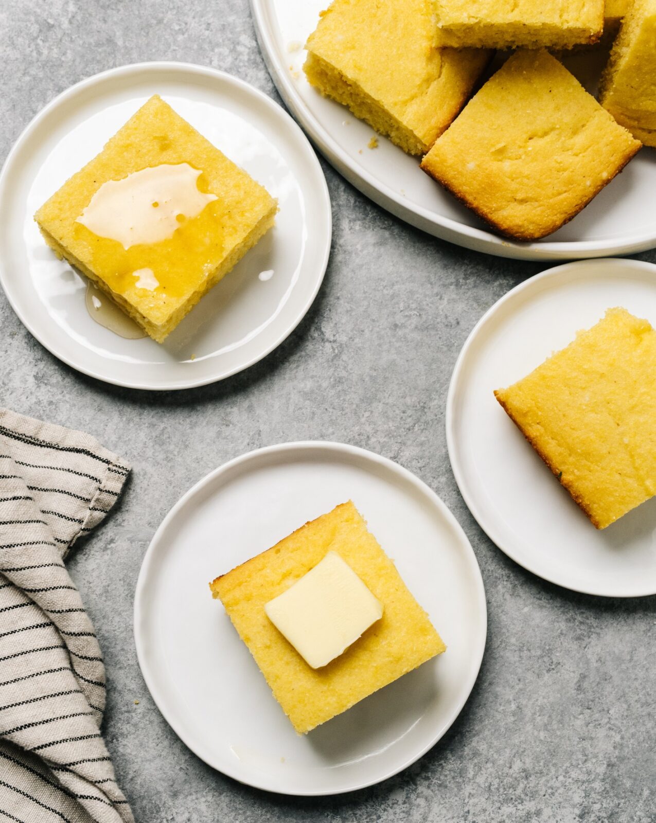 3. Remove the cast iron skillet or cake tin from the oven and coat the entire interior of the skillet or tin with butter until it’s well-greased. Pour the batter into the hot, greased skillet or tin and spread the top with a spatula to even it out. Place in the oven and bake for 25 minutes, then drop the oven temperature down from 200ºC to 175ºC and continue to bake for an additional 10 to 15 minutes until the cornbread is well-risen, golden brown, and a toothpick emerges clean of any crumbs. (If at any point during baking you notice that the top is browning too quickly, place a tented piece of foil over the top.)