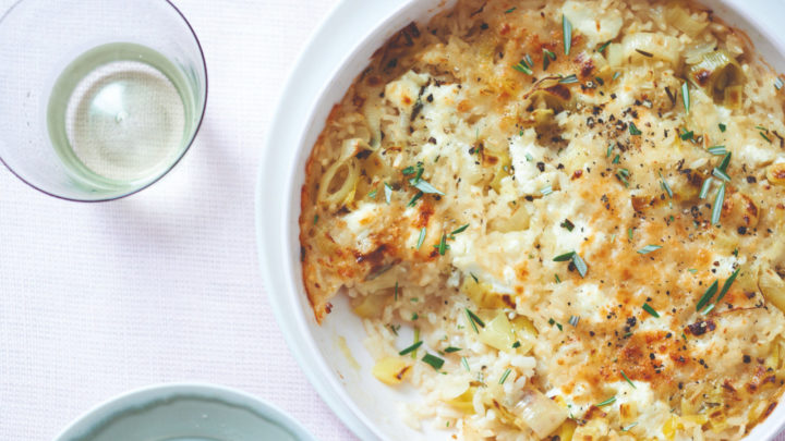 - Preheat the oven to 200°C/gas mark 6. Heat a large ovenproof dish over medium heat. Add the olive oil, butter, onion, leek, garlic and sea salt, and cook, stirring occasionally, for 5–6 minutes, or until the vegetables are softened. Add the rosemary and rice and stir over the heat for another minute. Pour in the stock and bring to the boil.