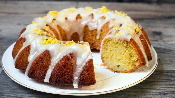 For the glaze, combine the icing sugar and lemon juice and pour over the cake. Top with a sprinkling of lemon zest to finish (optional).