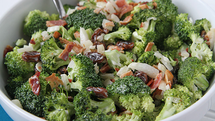 – Combine broccoli, bacon, raisins and onions in a large bowl
