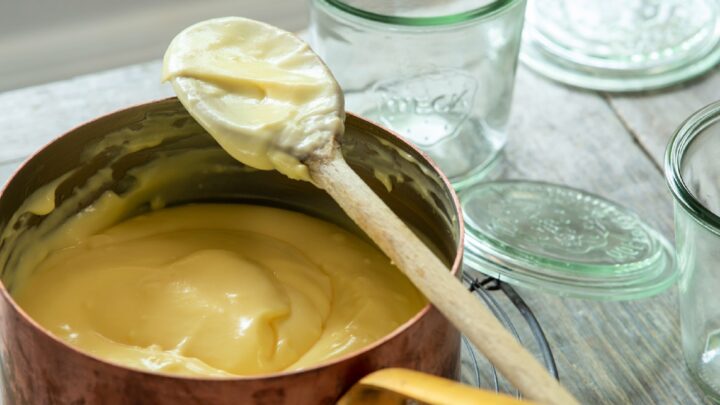 Next, very slowly pour the warm milk and cream into the egg mix bowl and whisk very well. Leave it for a second while you quickly wash the saucepan out, then pour the whole lot back into the clean saucepan and cook, stirring constantly with a wooden spoon, until thick. The moment it thickens (it’ll do it suddenly – and look kind of lumpy), take it off the heat and whisk, whisk, whisk. There’s enough residual heat to finish cooking for the next minute, and you make it silky smooth by whisking. Easy.