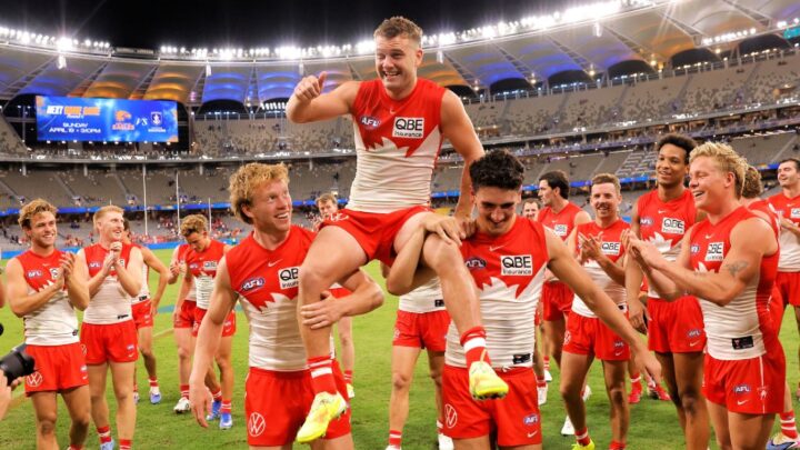 The Swans kicked the first 11 goals of Saturday night’s match on the way to the stunning 24.19 (163) to 4.11 (35) victory in front of 50,723 fans at Optus Stadium.