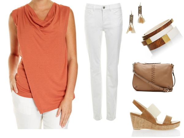 I find white denim jeans to be one of the most versatile items to have in my wardrobe. I can transform their look into anything I want by changing the way I style them. I love this soft draped top and gorgeous tan and bronze accessories to create a glamorous ensemble that will take you out to lunch, dinner or wherever the day may take you.