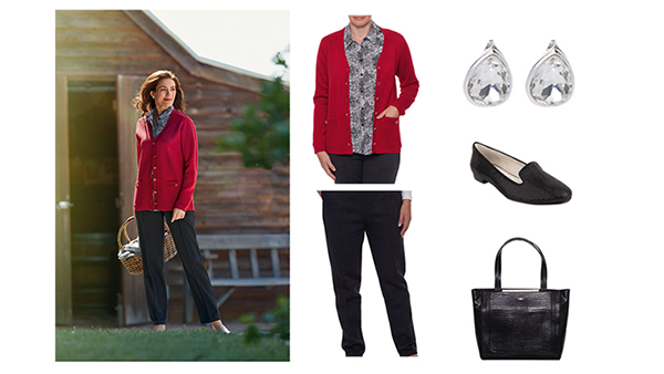 Be bold in this look with the bright red cardigan teamed with some shiny accessories. Perfect for a relaxed, smart evening occasion!
