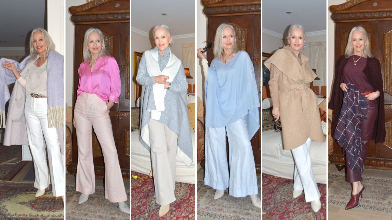In the above images, I have demonstrated how to layer colours, such as: white and ivory with mauve for a chilly day; cerise pink with blush for a warmer day; grey with stone for those in-between days; blue on blue for warmer days; winter white with camel; and warm plum and burgundy blends. The latter is my current new black, an alluring change.
