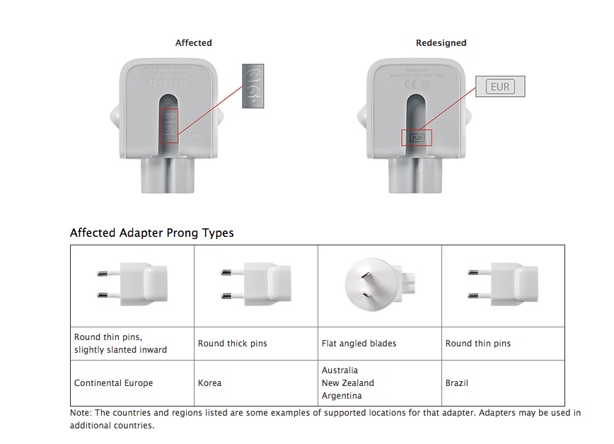 Apple will exchange affected wall plug adapters with a new, redesigned adapter, free of charge.