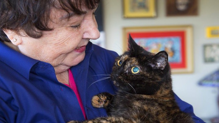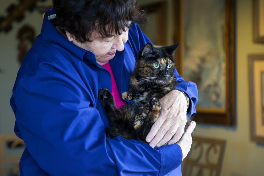 Like most of us when we get older, Voorhees and her cat enjoy sitting on the couch reading and listening to music.