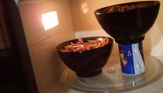 All you need to do is place one bowl in as normal and then put a mug upside down next to it. Place your second bowl on top and watch as they cook in half the time. It’s so easy! But do be careful. This trick might not be suitable for anything that has a lot of liquid, which can spill if not done properly.