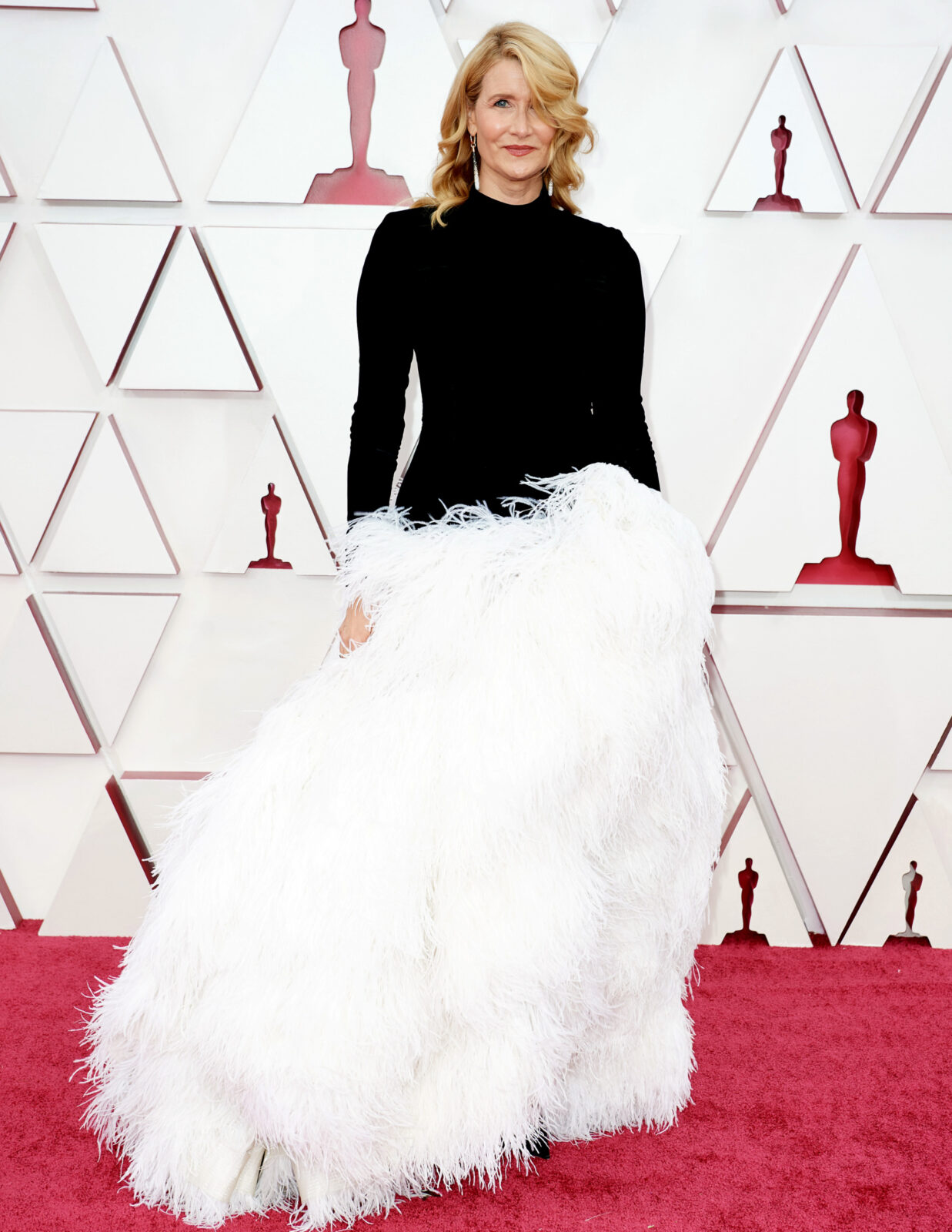 Laura Dern made quite the appearance on the red carpet, with a white ostrich feather gown reminiscent of singer Bjork’s infamous ‘swan gown’ from 20 years ago. The 54-year-old actress paired the eccentric Oscar de la Renta number with shoulder-duster earrings and a set of black, strappy jewel-encrusted heels.