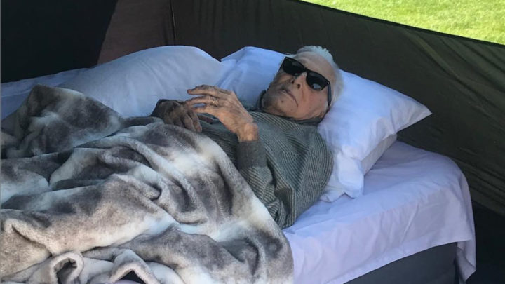 The acting legend can be seen lying on an inflatable mattress inside of a tent in a series of sweet candid photographs, which were shared on social media by his grandson Cameron Douglas.