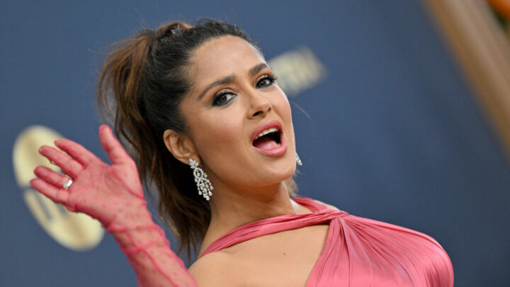 Posting to Instagram on Tuesday, March 1, Hayek shared a hilarious video of herself and SAG-AFTRA president Fran Drescher. In the video, and indeed at the awards, Hayek was wearing a gorgeous Grecian inspired frock with hair in a tousled pony, and stunning, dramatic makeup. The salmon pink number and colour matched, sheer Gucci gloves were a killer combination for the Desperado star, however, they did present an awkward issue…