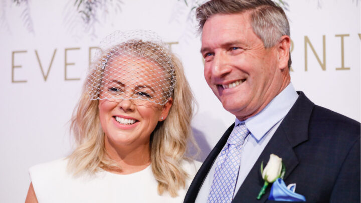 The soon-to-be-wed couple beamed as they stood alongside each other at the TAB Epsom Day yesterday. The Sunrise star looked sensational in a white Carla Zampatti dress and vintage-style veil headpiece, while Richard, 60, looked dapper in a dark navy suit.