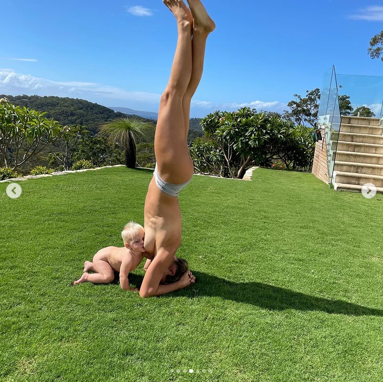 While there were a number of photos in the post, there was one that garnered particular attention: a snap of the 34-year-old wearing just a pair of knickers, upside down in a headstand, while baby Flow breastfed.