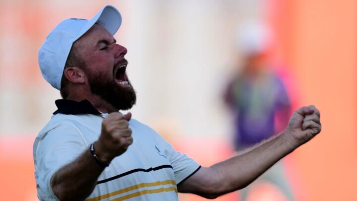 Shane Lowry delivered the crucial half-point in match number eight, taking Europe to 14 points by holing a putt to tie against Russell Henley.