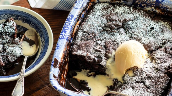 In a saucepan, melt your butter. Over the butter, sift in the flour, sugar, half the cocoa powder and a pinch of salt, and stir well to combine, then stir in the milk and vanilla. Scrape into a greased pie dish. Combine the brown sugar and remaining cocoa powder and sift over the top of the batter. Pour the boiling water over the top. Bake for 20 minutes, or until just cooked in the centre.