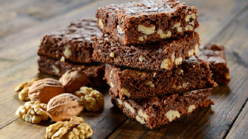 Preheat oven to 165 C degrees. Melt butter in saucepan with cocoa and stir until smooth. Remove from heat and allow to cool for a few minutes. Mix in eggs, one at a time. Add sugar, flour, nuts, vanilla and salt. Pour into a greased 20cm x 20cm square pan. Bake 40 minutes. ”Don’t overbake!” They should be gooey. Let cool (an essential step) and cut into bars.