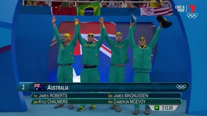 After four long years of training the Australian 4x100m men’s freestyle relay team will be standing on the podium to claim their bronze medal after a nail-baiting race only minutes ago.